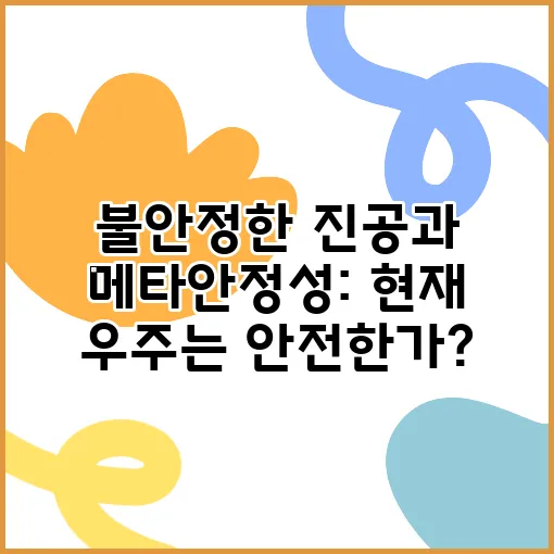 여러분, 우리 우주가 정말 안전한지 궁금하신가요? 불안정한 진공과 메타안정성이라는 두 개념이 이 질문과 밀접하게 연관되어 있습니다. 현재의 우주 환경에 대한 우리의 이해는 깊어지고 있지만, 그만큼 불확실성도 커지고 있습니다. 여러분과 함께 이 신비로운 주제를 심층적으로 탐구해 보도록 하겠습니다. 그러면 불안정한 진공이란 무엇이며, 왜 이런 상태가 우주 안전성에 영향을 미칠까요? 여러분의 호기심을 시원하게 풀어드릴 수 있도록 노력하겠습니다.